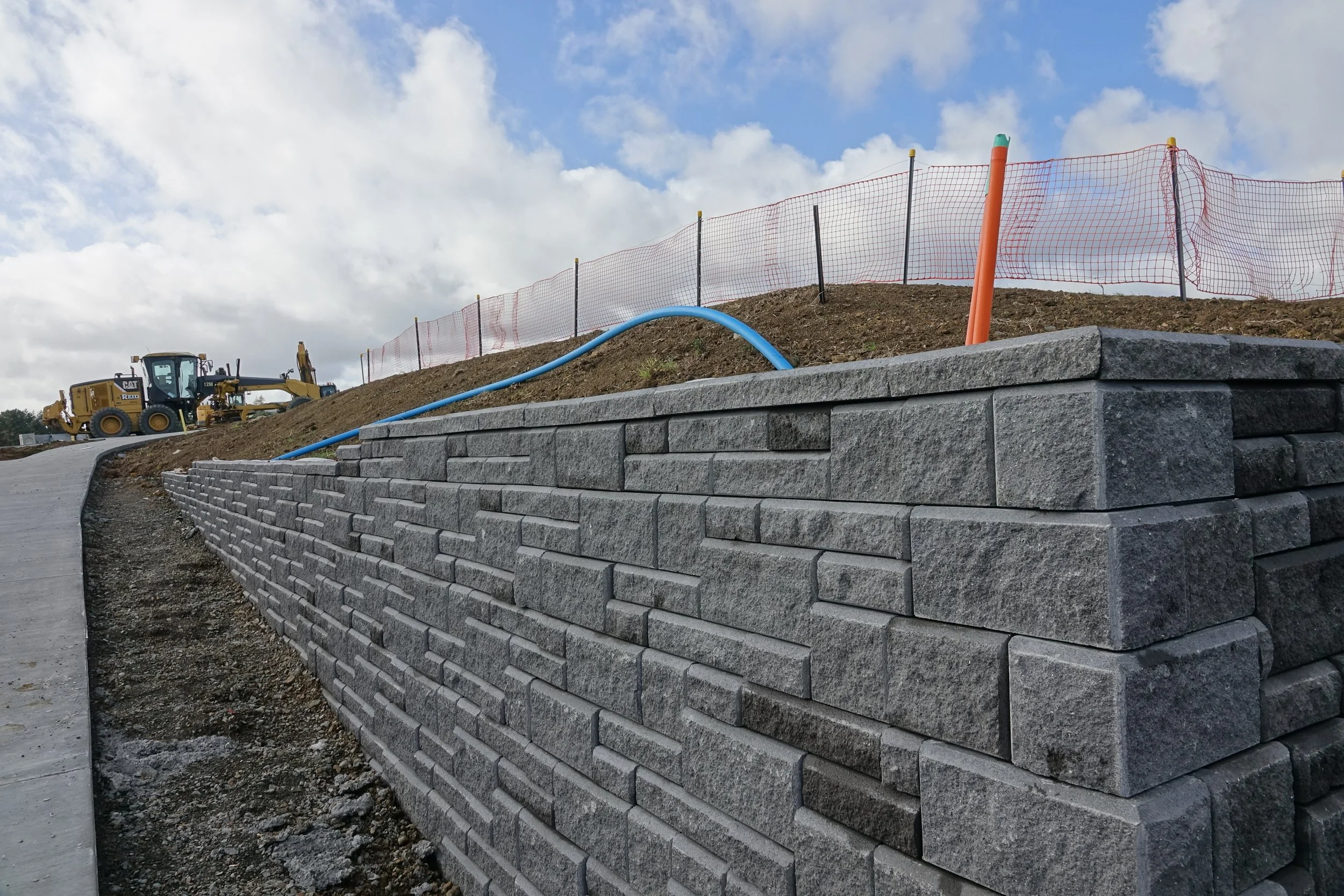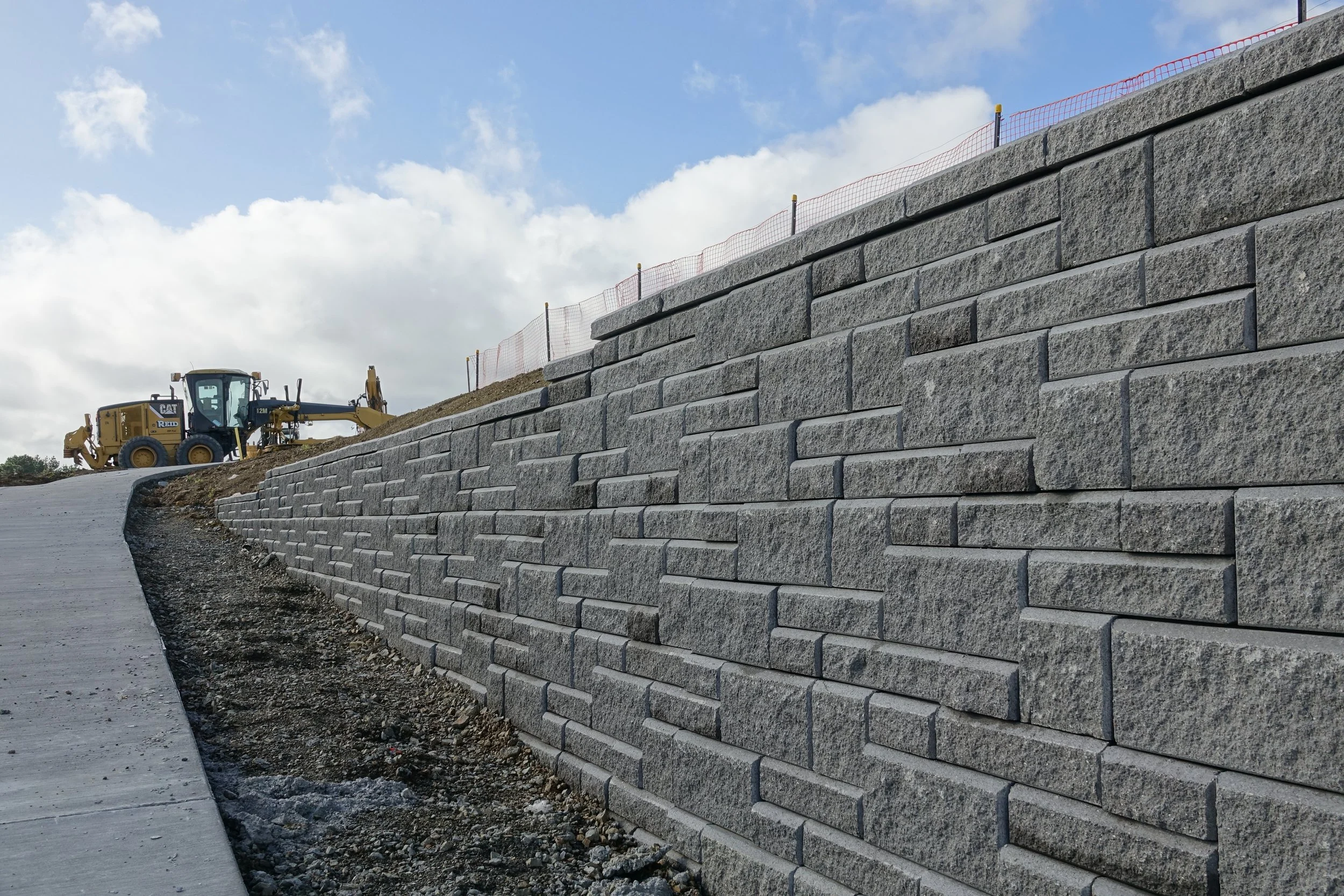 To meet the twin goals of aesthetics and performance, the team selected the AB Ashlar Blend™ system in an Iron Sand finish, using a two-course pattern configuration. ICB worked closely with the client, engineers, and block manufacturer (Bowers Brothers Concrete) to refine the design. Geogrid-reinforced soil was chosen to stabilise the steep 1 in 3 slopes and increase wall mass.