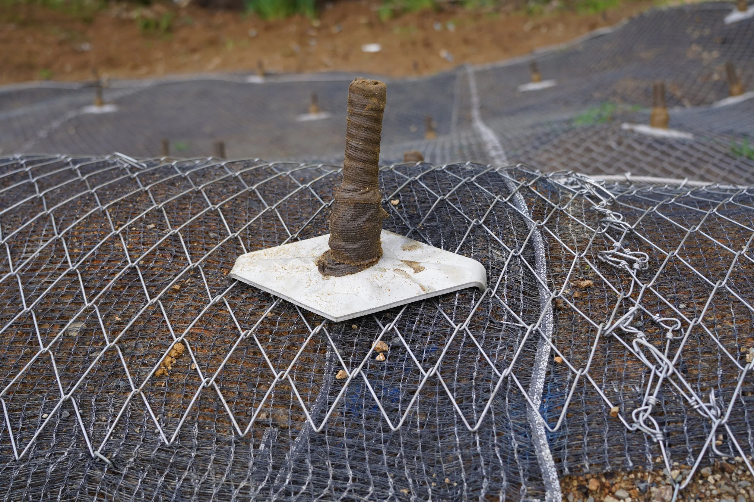High-tensile steel mesh pinned to the slope to prevent erosion