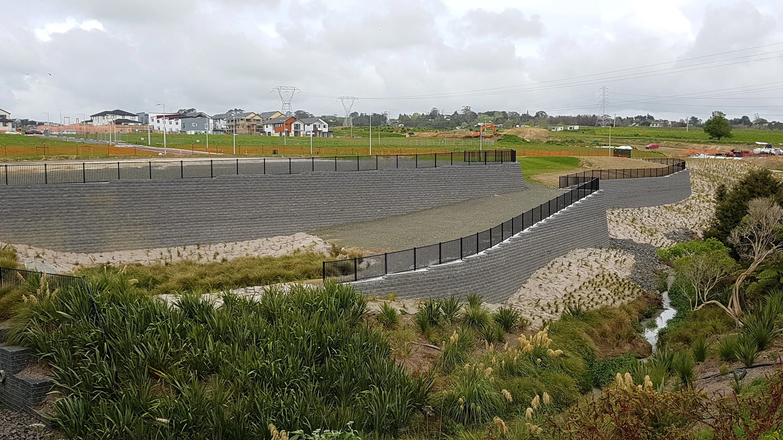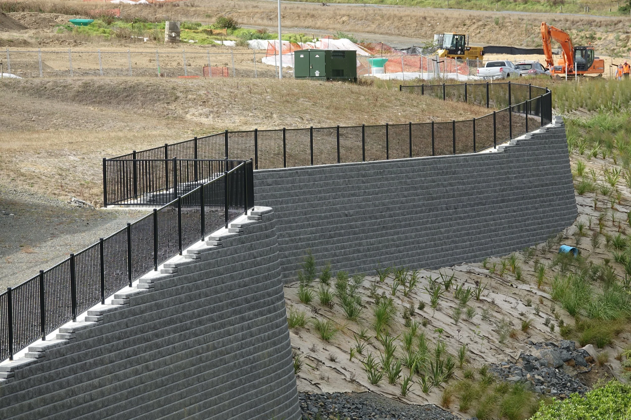 The 125a Murphys Road site presented several development challenges: formerly rolling farmland, it needed to be reshaped into a modern residential zone featuring a childcare centre, homes, and a retirement village — all within a hilly terrain surrounded by native bush. Retaining walls were critical for managing elevation changes, supporting roads and lots, and preserving aesthetics. One wall needed to accommodate a stormwater pipe, and the geogrid foundation layout required careful adjustment to site-specific constraints.
